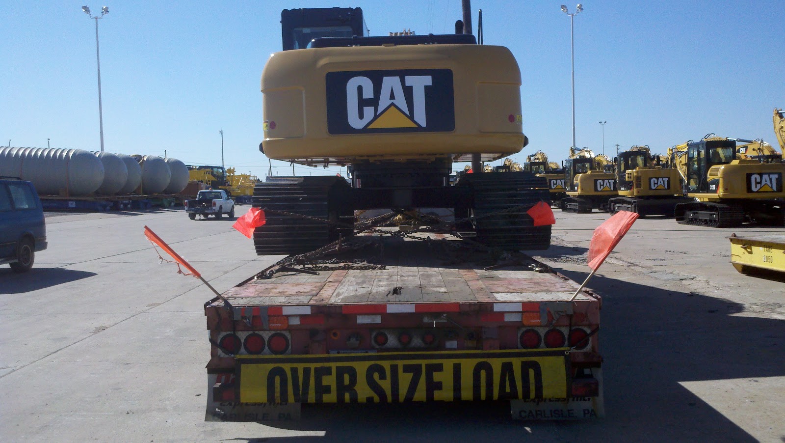This morning drove down to Galveston, TX to the port for my next load. Picked up a brand new Caterpillar Excavator. I had to load it, by myself, on my trailer. Having never driven one of these before, I was really looking forward to doing that. Backed up to the loading ramp then went searching for it. There were two long lines of excavators there. I got lucky and found it quickly. Got in, started it up, drove it over to the truck, up the ramp, and onto the trailer. No problem. I forgot to mention that it was wider than my trailer. It was FUN!! I love this job!! I get to play with the "big boy toys"!! This is my first (of many) oversize loads with Daily Express. Chained it down and got on the road. Stopped at the scales and found out that I had too much weight on the trailer axles so I had to un-chain it and move it up a few feet. Re-chained it and got back on the scales again. This time it was OK. I am 82,500 pounds and 10' 6" wide.
